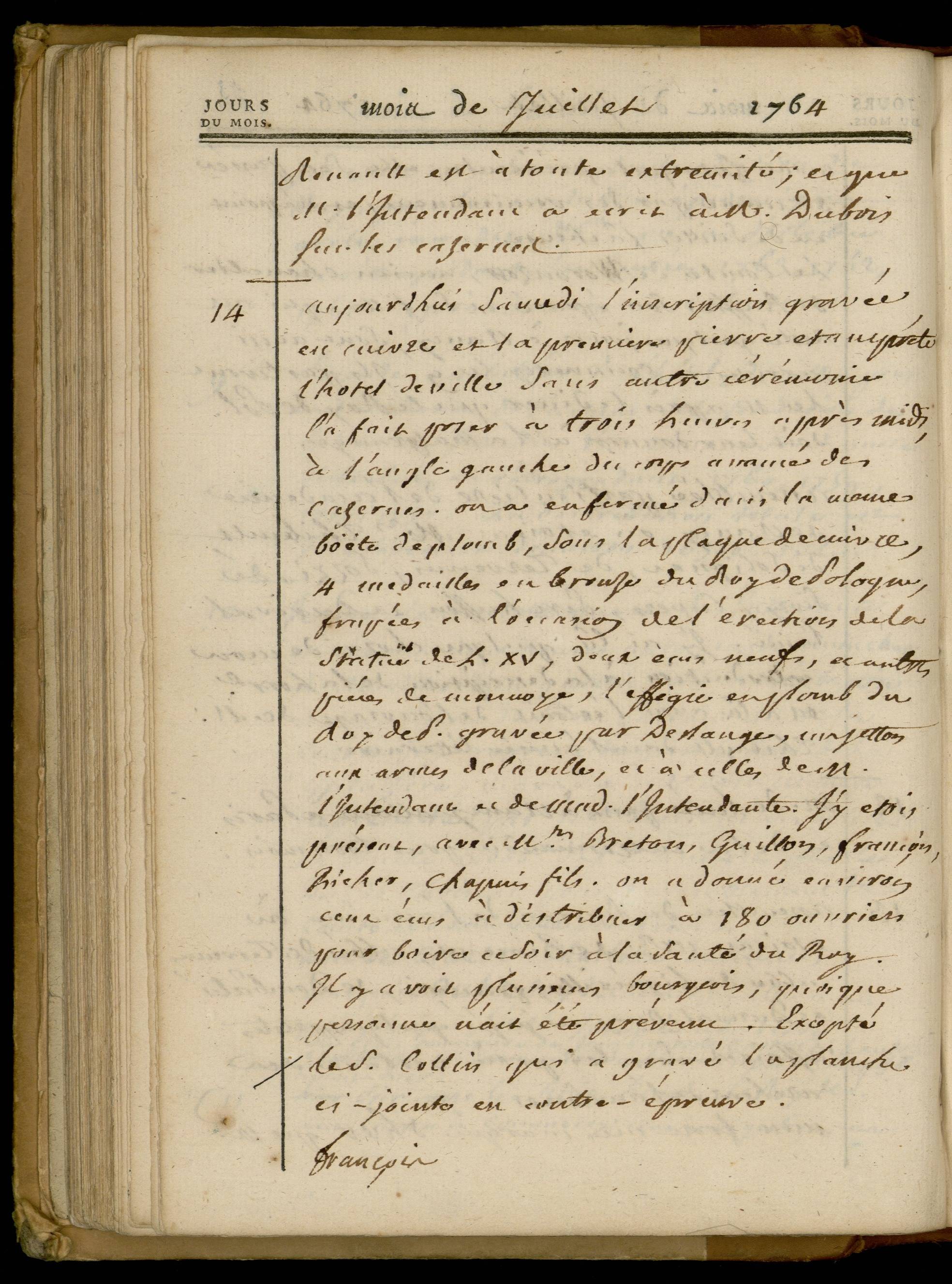 Aujourd’hui samedi l’inscription gravée en cuivre et la premiere pierre étant prête, l’hôtel de ville sans autre cérémonie l’a fait poser à trois heures après midi, à l’angle gauche du corps avancé des cazernescasernes. On a enfermé dans la même boëteboîte de plomb, sous la plaque de cuivre, 4 médailles en bronze du RoyRoi de Pologne, frapéesfrappées à l’occasion de l’érection de la statue de LLouis XV, deux écus neufs, et autres pièces de monnoyemonnaie, l’effigie en plomb du RoyRoi de P. Pologne gravée par Derlange , un jettonjeton aux armes de la ville, et à celles de M. l’Intendant et de Mad.madame l’Intendante. J’y étoisétais présent, avec Mrs.Messieurs Breton, Guillon, François, Richer, Chapuis fils. On a donné environ cent écus à distribuer à 180 ouvriers pour boire ce soir à la santé du RoyRoi. Il y avoitavait plusieurs bourgeois, quoique personne n’ait été prévenu. Excepté le S.sieur Collin qui a gravé la planche ci-jointe en contre-épreuve.